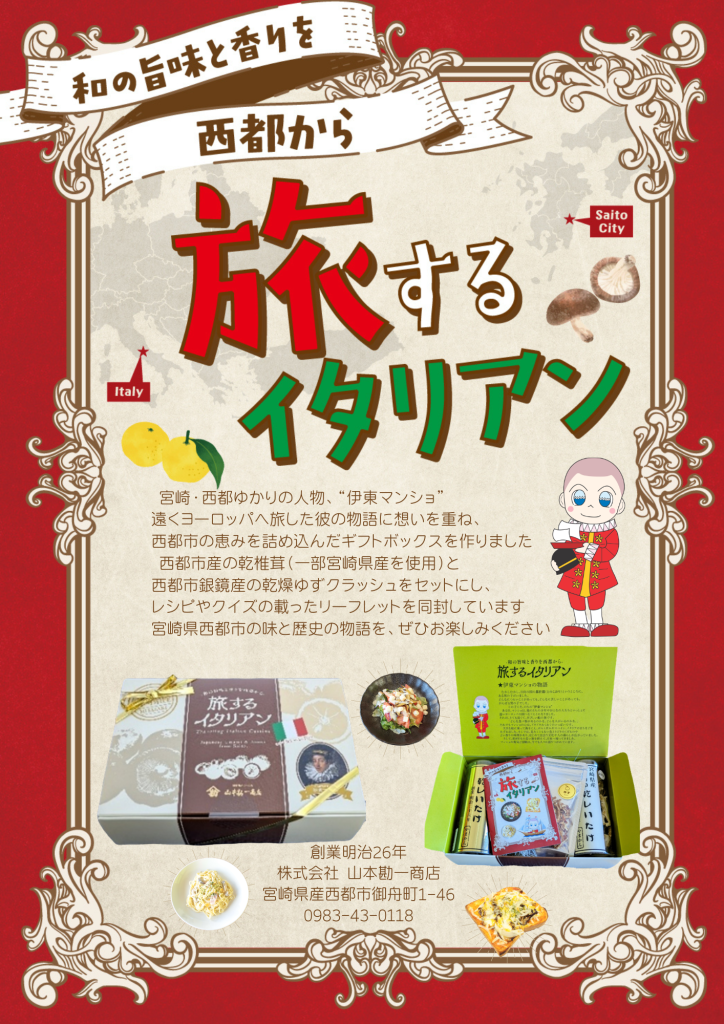 商品の中身は、西都市産の乾椎茸(一部宮崎県産使用)と西都市銀鏡産の乾燥ゆずクラッシュのセットです。 付録として、プチ・イタリアンレシピやクイズの載ったリーフレットを同封していますので、マンショ(※)の異国体験を想像しながら、宮崎県西都市の味と歴史の物語を、ぜひお楽しみください。